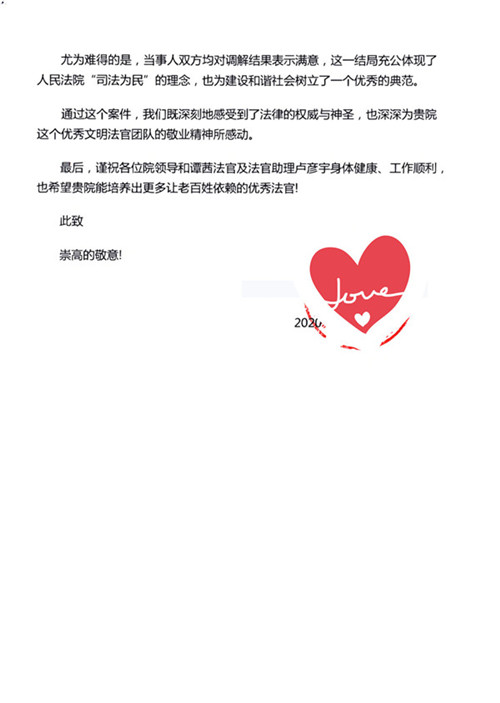 原告、被告和几位来访人均对法院工作表示十分满意,并为福田法院高效调解和火速解封点赞。4月13日、14日,福田法院连续收到了原告代理人和被告寄送的感谢信。